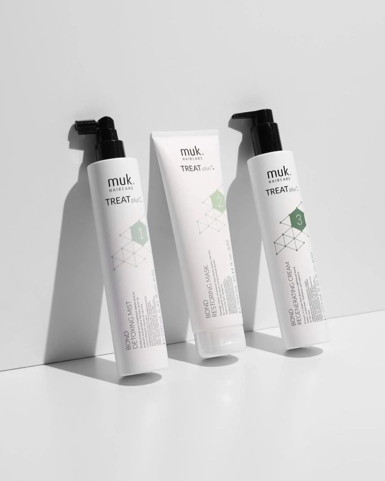 Three bottles of Muk Haircare TREAT plus treatment products against a white background with shadows, labeled as Detoxing Mist, Bond Restoring Mask, and Rejuvenating Cream.
